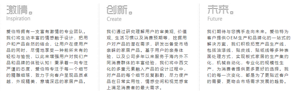 愛(ài)伯特家居有限公司屬中外合資企業(yè),成立于2007年,坐落于福建漳州北斗工業(yè)園區(qū),占地66000平方米。對(duì)于板式家具,木質(zhì)家居產(chǎn)品,我們專業(yè)的團(tuán)隊(duì)有著世界頂級(jí)的生產(chǎn)能力,產(chǎn)品原料及品質(zhì)要求符合國(guó)際各類管理體系的標(biāo)準(zhǔn)。愛(ài)伯特自創(chuàng)始之日起至今,始終保持超乎尋常的成長(zhǎng)速度。我們與(HomeDepot,Lowes,Aldi,Lidl